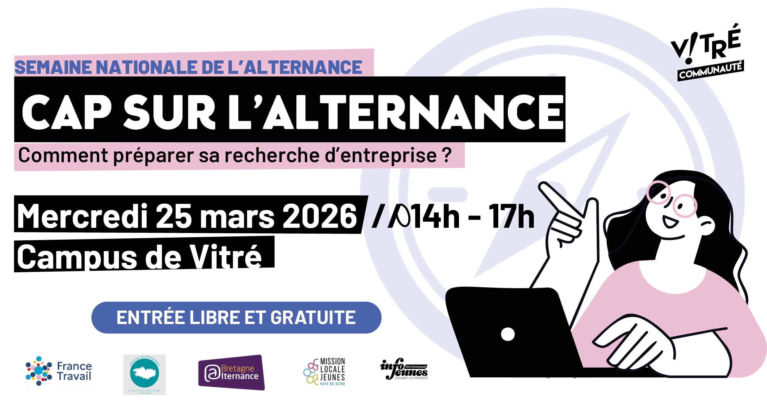 Un événement en partenariat avec France Travail, Breizh’Alternance, Bretagne Alternance, la Mission locale du Pays de Vitré et le service Info Jeunes.